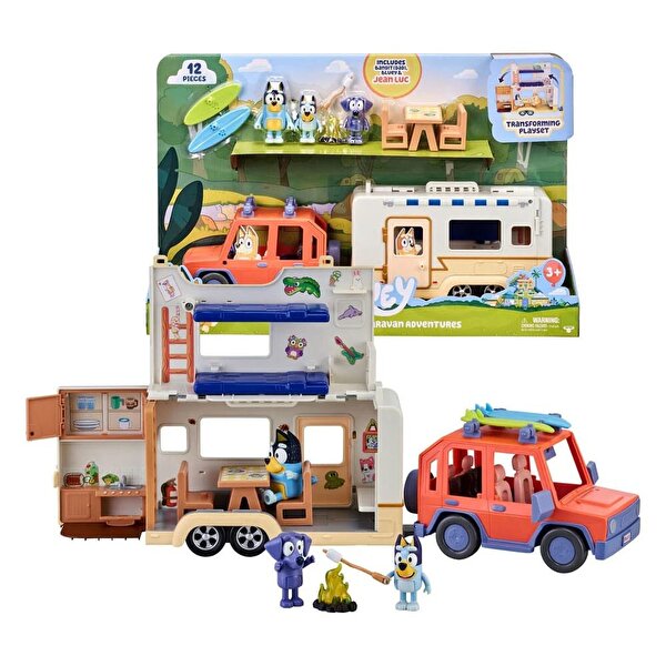 Arabada tüm ailenin seyahat edebileceği bolca yer var! Sadece tavanı açın ve figürleri koltuklara yerleştirin. Bluey'nin Karavan Macerası oyun seti, oynamak için 12 parçadan oluşuyor.