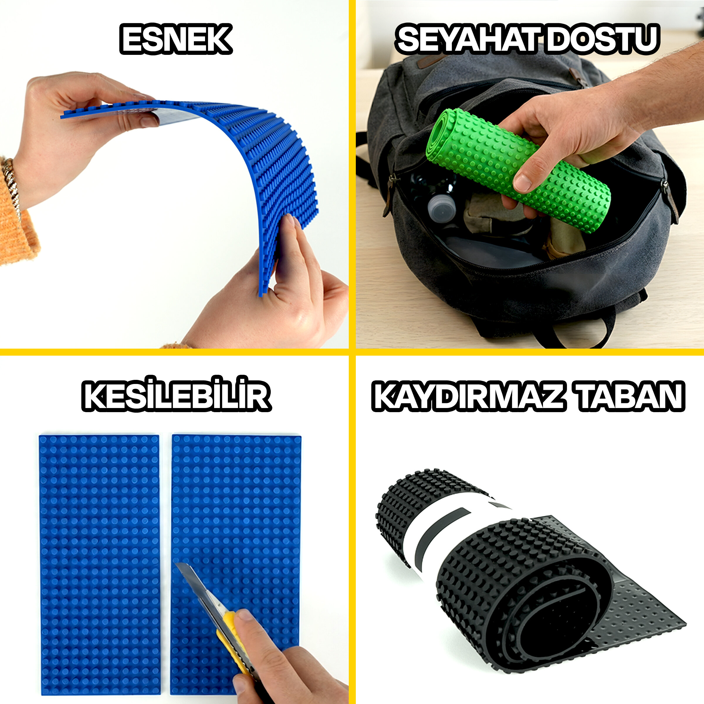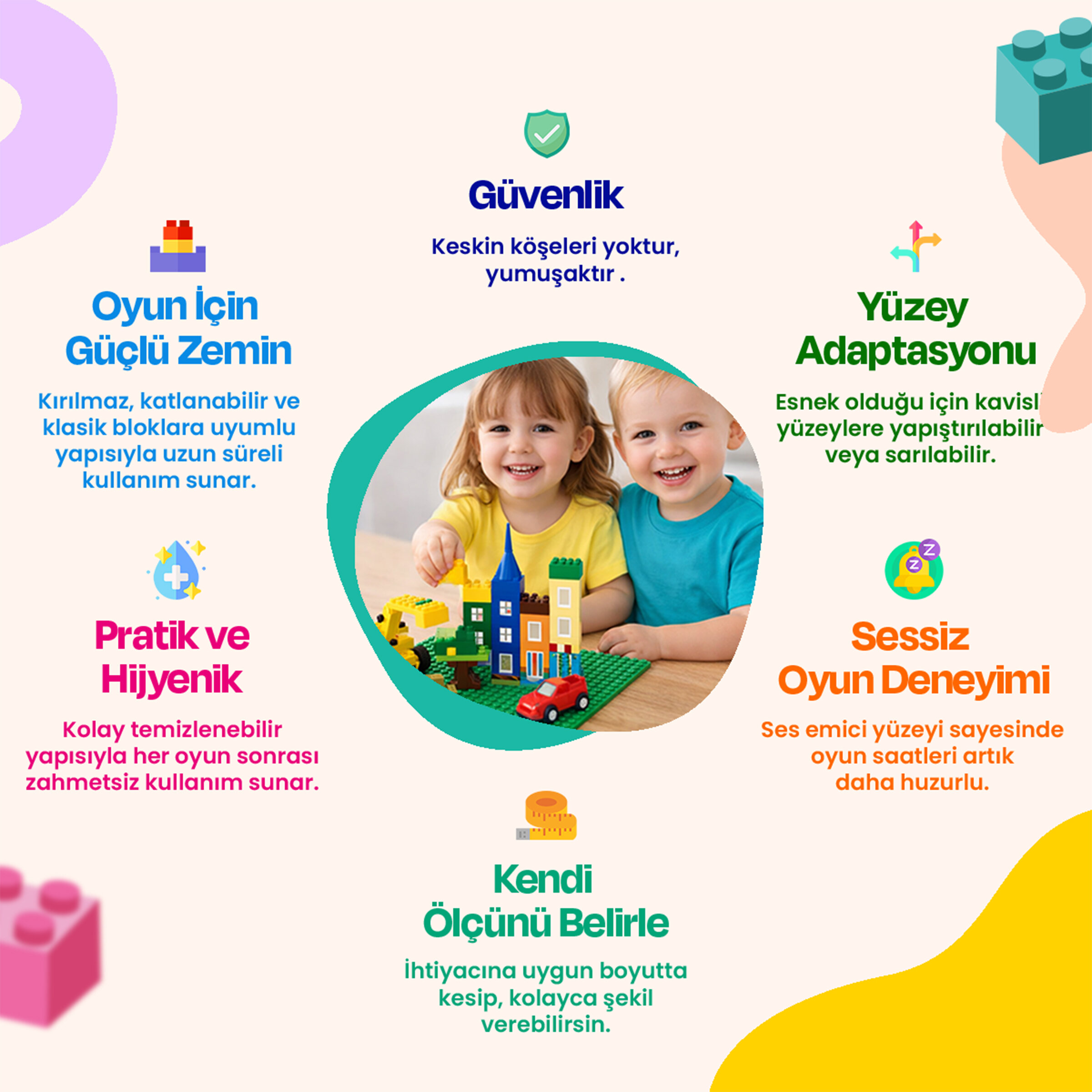 Çocukların hayal gücünü özgürce geliştirebileceği esnek blok mat, klasik bloklarla tam uyumlu yapısıyla eğlenceyi ve öğrenmeyi bir araya getirir.