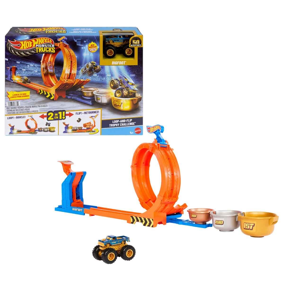 Hot Wheels® Monster Trucks Döngü ve Takla Bigfoot Oyun Parkuru setinde, 50. yıl dönümüne özel metal Bigfoot oyuncak kamyon ile yarışıp akrobasi hünerlerinizi sergileyin.