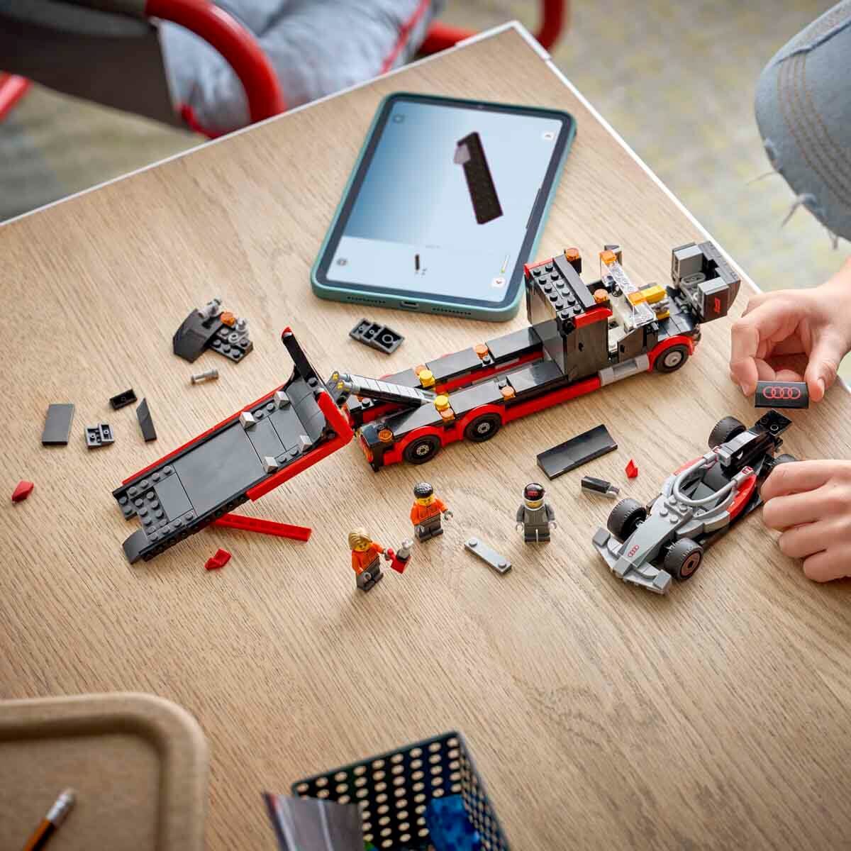 Çocukların LEGO F1 sergi kamyonu oyuncağı ve Audi Formula 1 yarış arabası inşa ederken ihtiyaç duyacakları her şeyin yanı sıra, yaratıcı oyunlar için Audi yarış pilotu ve 2 pit ekibi mini figürü içerir.