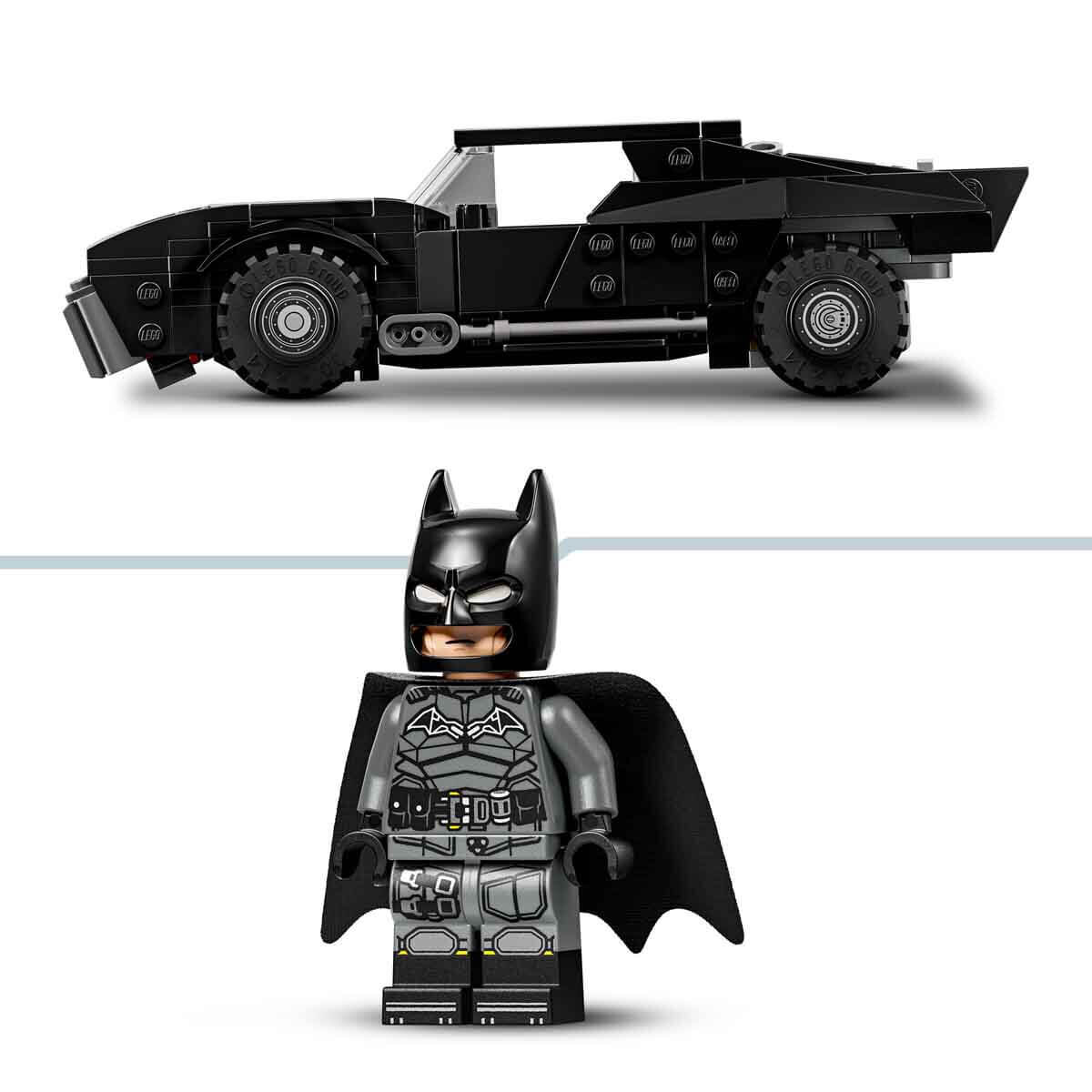 Batman mini figürü; kumaş pelerinli bir süper kahraman LEGO mini figürü ve çıkarılabilir kaputun altında Batmobil modeline yerleştirilmiş hatıra altın para içerir.