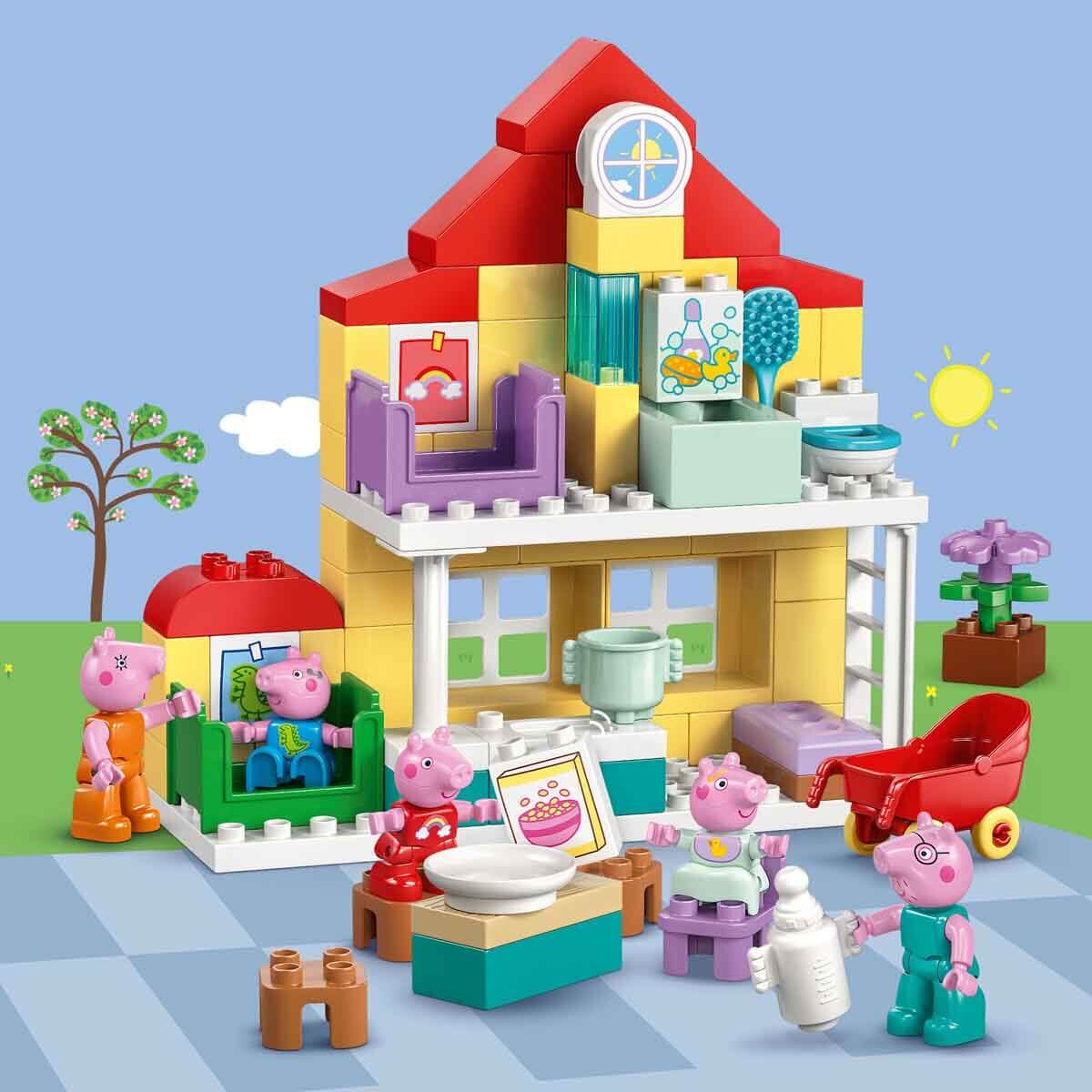 2 yaş ve üstü kız ve erkek çocuklara yönelik bu hediye, Evie Pig dahil olmak üzere 5 Peppa Pig karakterinin tamamını içerir. Tıpkı dizide olduğu gibi bu 2 katlı LEGO DUPLO oyuncak evde George ve Peppa Pig için ayrı odalar, mutfak, banyo ve salon bulunur.