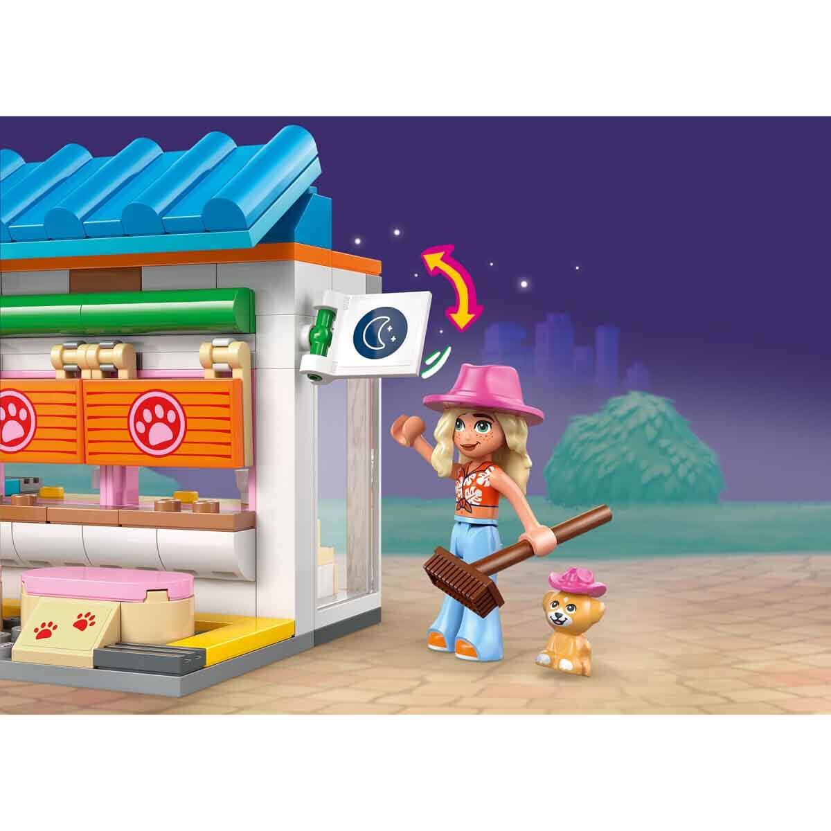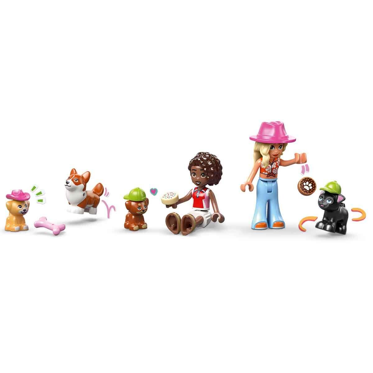2 LEGO Friends karakteri: Aliya ve Sage mini bebekleri, 4 oyuncak köpek ve evcil hayvan kapısı, rampa, bisküviler, eğlenceli tabelalar ve evcil hayvan taşıma çantası gibi hayvan dostu birçok eğlenceli detay ile birlikte gelir.
