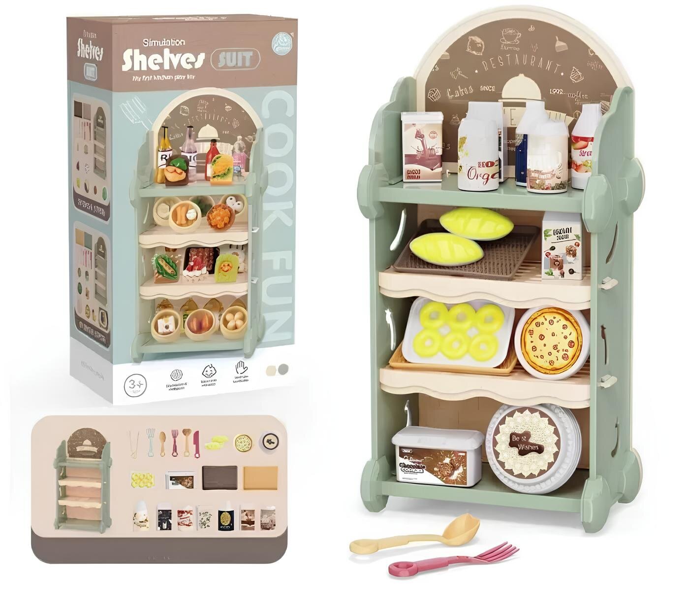 Bu detaylı tasarıma sahip simülasyon restoran rafı seti, çocuklara eğlenceli bir rol yapma deneyimi sunar.