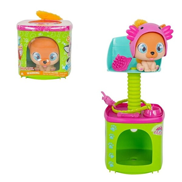 Set içerisinde: 1 adet yavru köpek, köpek evi, 6 aksesuar, çıkartma kağıdı ve koleksiyon kağıdı içerir.